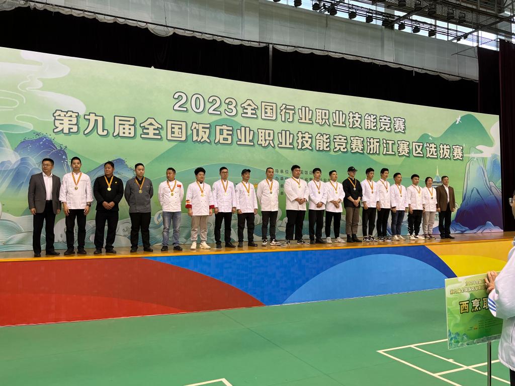 图1 第九届全国饭店业职业技能竞赛浙江赛区选拔赛颁奖现场(楼洪亮位左5)