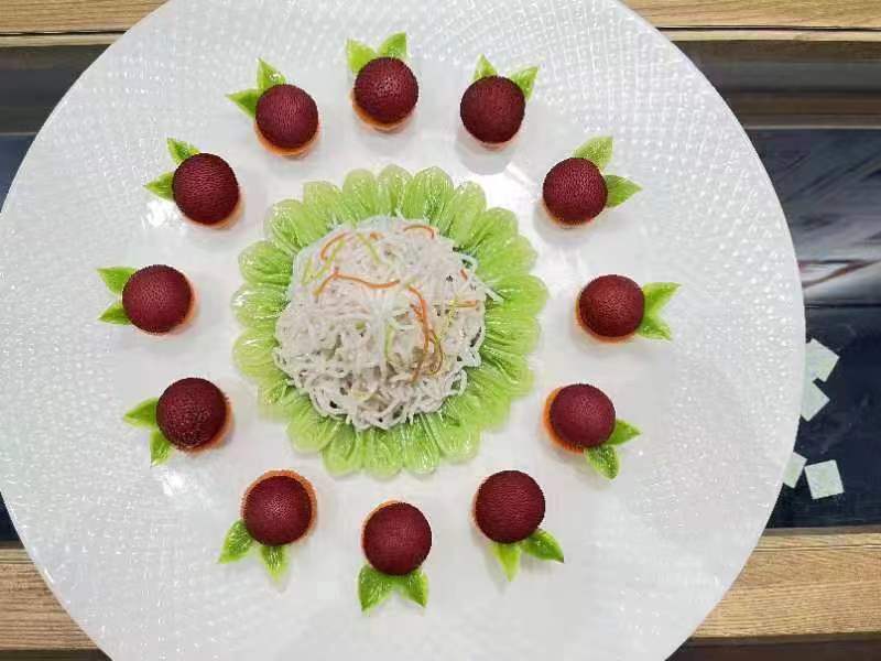在竞赛过程中,楼洪亮老师不仅凭借扎实的基本功展示了令人惊叹的刀工和火候水准,还在“自选热菜环节”作品“乾坤杨梅肚[dǔ]”中,通过对食材的巧妙重塑和组合,呈现了十足的创意。